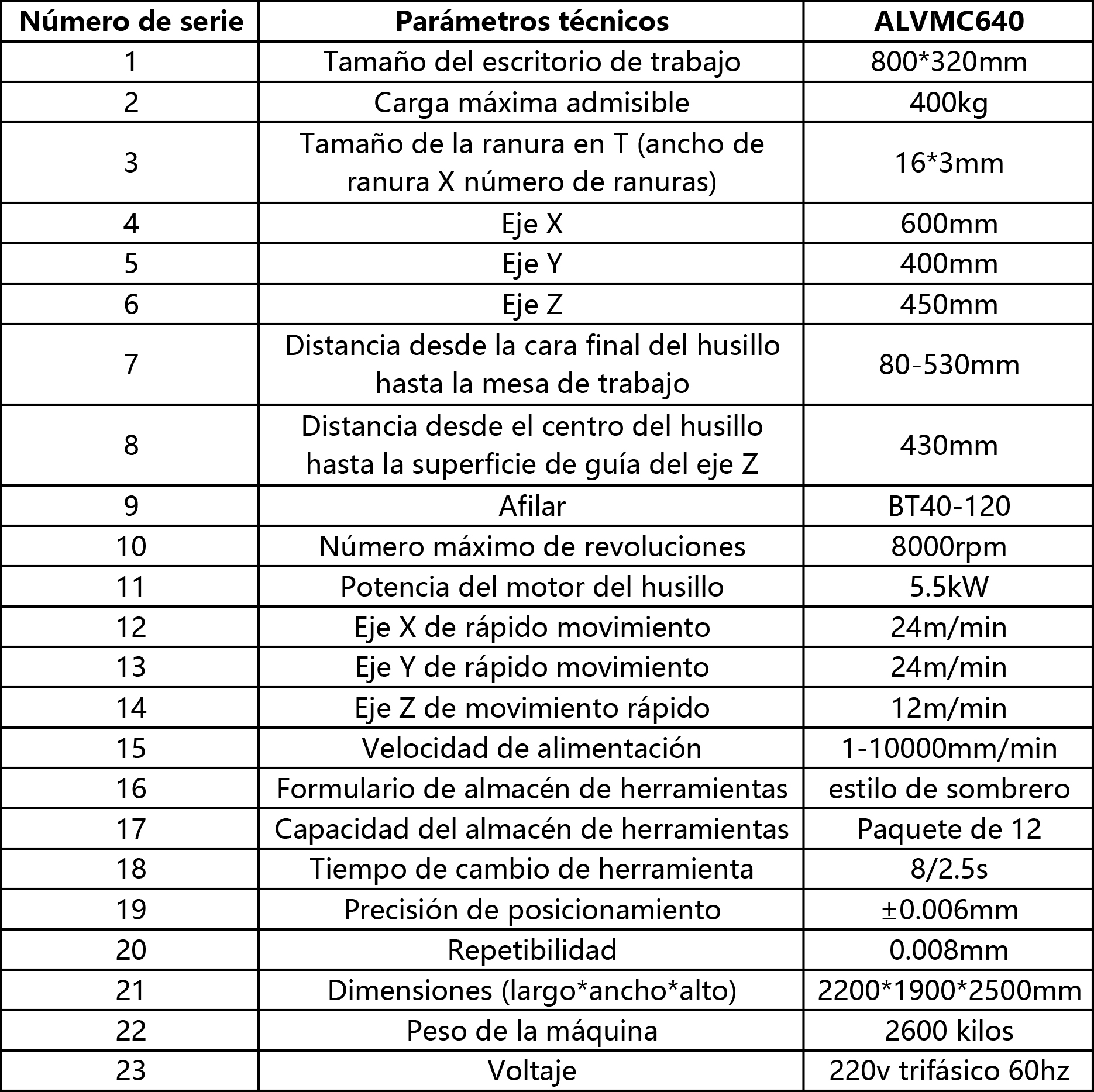 El ALVMC640 incorpora una base y columna de hierro fundido de alta rigidez que proporciona un soporte estable durante el corte. Está equipado con un servohusillo y guías lineales, lo que garantiza un funcionamiento suave y una precisión constante. Gracias a su tamaño compacto, la máquina se adapta perfectamente a talleres con espacio limitado, manteniendo una alta productividad. El cambiador automático de herramientas de serie y el sistema de lubricación centralizada mejoran la automatización y reducen el tiempo de inactividad.